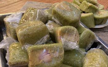 Giò thủ sau khi lấy ra khỏi tủ lạnh, bạn bóc bỏ lớp lá chuối.