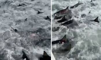 Hàng trăm cá mập tấn công đàn cá mòi dưới thuyền ngư dân