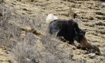Bò Tây Tạng cứu con non trước hàm báo tuyết