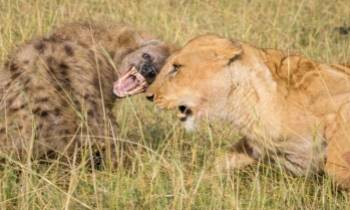 Bầy linh cẩu vây đánh sư tử trong trận chiến giành mồi