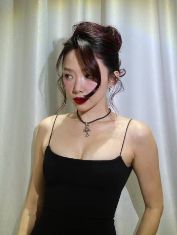 Quỳnh Chi hào hứng chụp ảnh check-in cùng các hashtag cầm tay