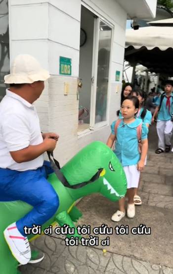 Ông bố hài hước nhất cõi mạng tái xuất, hóa thân thành khủng long đón con gái trước cổng trường, bạn bè siêu ngưỡng mộ