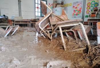 Trường học tan hoang, bàn ghế, sách vở ngập trong bùn đất sau lũ