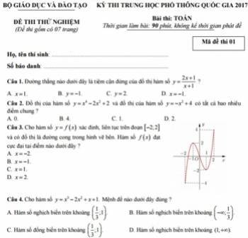 Đề thi thử nghiệm THPT quốc gia môn Toán