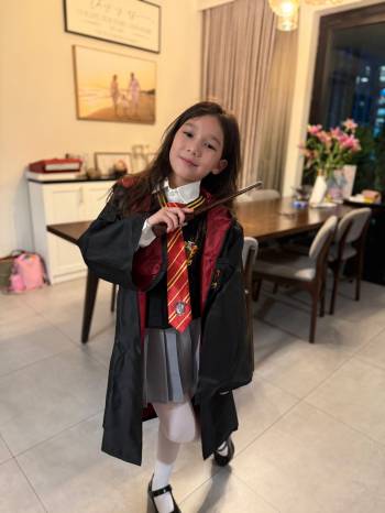 Bà mẹ trẻ trung phối thêm một số phụ kiện như khăn choàng sáng màu hoặc túi xách để thêm phần điểm nhấn cho bộ trang phục.
