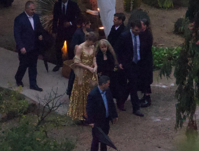 Ca sĩ Taylor Swift nổi bật trong bộ đầm vàng lấp lánh khi tham dự lễ cưới nữ nhạc sĩ Este Haim ở California, tối Giao thừa.