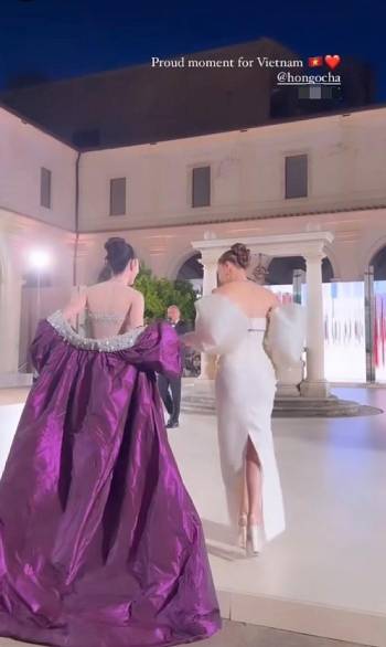 Hồ Ngọc Hà mang giày cao chót vót, đưa tay giúp đỡ một sao nữ mặc váy cồng kềnh