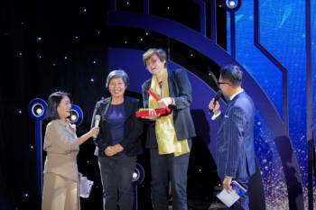Người đẹp phim 'Váy hồng tầng 24' nhí nhảnh khi được MC Đình Toàn giới thiệu ra sân khấu. |