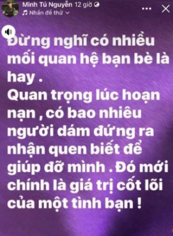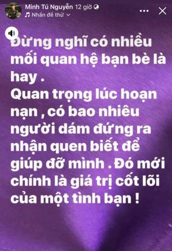 Minh Tú đăng đàn ẩn ý: "Đừng nghĩ nhiều bạn là hay, quan trọng lúc hoạn nạn bao nhiêu người giúp đỡ"