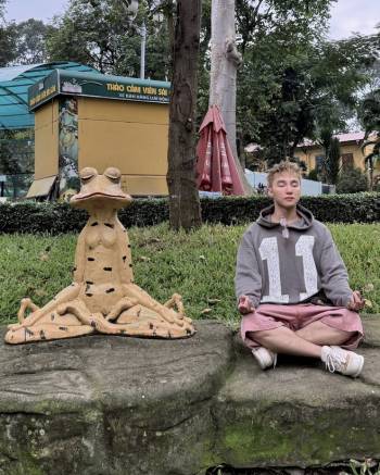 Xuống phố cùng nàng, Lâm Bảo Châu ăn vận đơn giản với áo cổ lọ được bao bọc bởi mẫu khoác dệt tông ghi phối cùng quần jeans dạng rách. Thêm phần thuận tiện cho cuộc thăm thú, anh chọn cho mình mẫu giày thể thao có phần cổ cao.